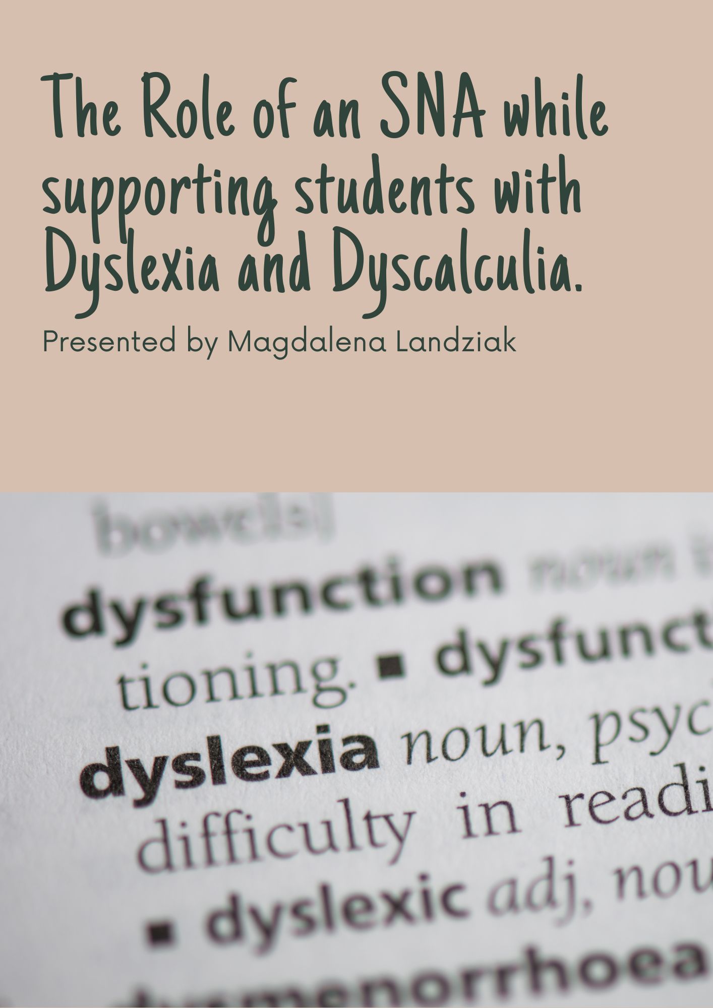 - The indicators of possible learning difficulties arising from dyslexia/dyscalculia and the role of an SNA in supporting these students.